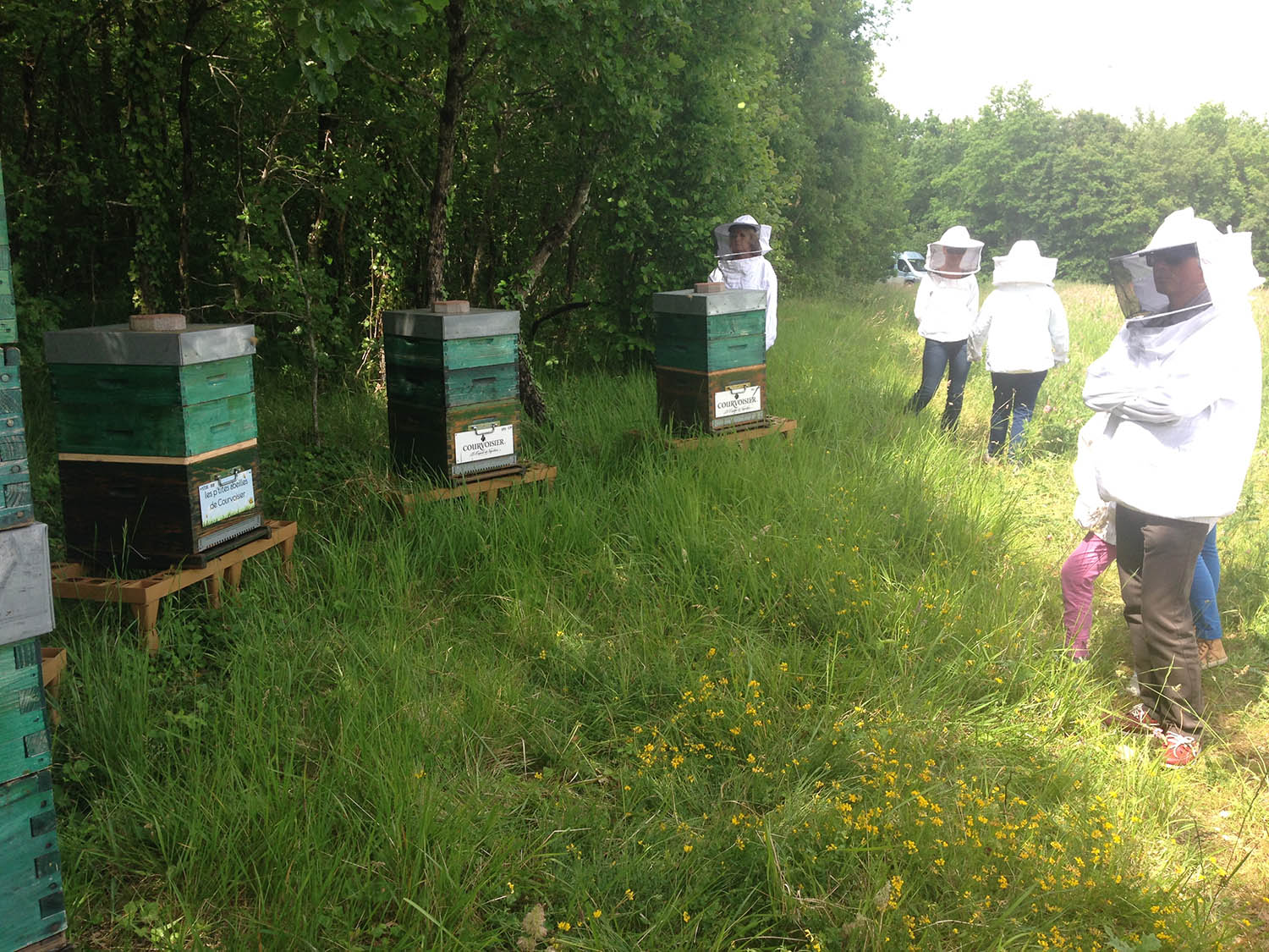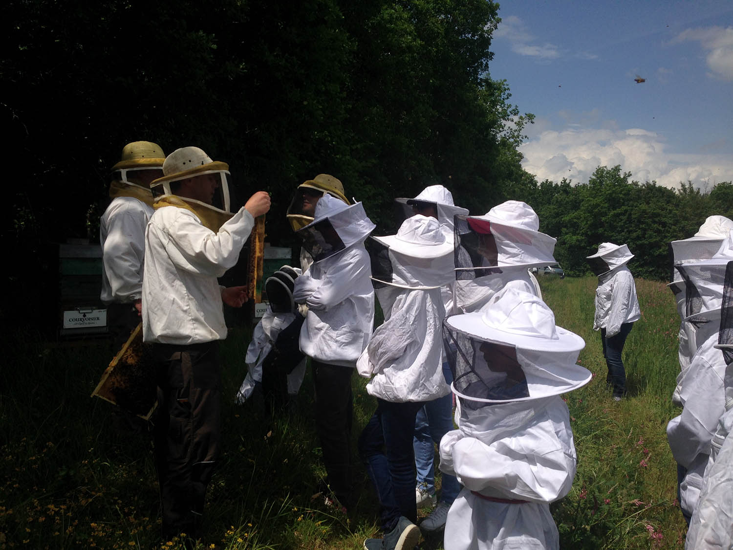 Nous nous sommes ensuite tous dirigés vers le rucher où les salariés, vêtus de vareuses de protection sont allés rencontrer leurs abeilles : Les Butineuses de Courvoisier.